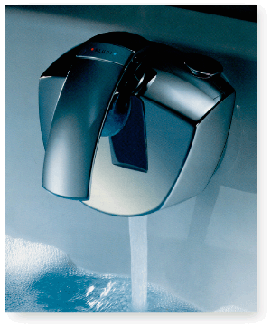 MEGAMIX kombinierte Wannenarmatur Vereint die Funktionen Wannenzulauf mit Einhebelmischer, Wannenablaufregelung, Brauseumsteller, Wannenüberlauf, Rohrtrennung Kludi-Armaturen, Menden, Deutschland DESIGN PLUS, ISH Frankfurt